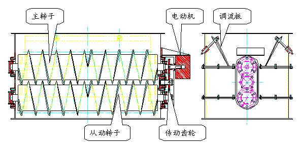 均勻分布煤流的關鍵零部件是一個帶不同旋向絞籠的主轉子,不同旋向的絞籠從主轉子的中心線向主轉子的兩頭延伸,在設備的旋轉過程中使集中落到主轉子中部的煤流隨著絞籠均勻分布到整個主轉子方向,達到均勻布料的效果。