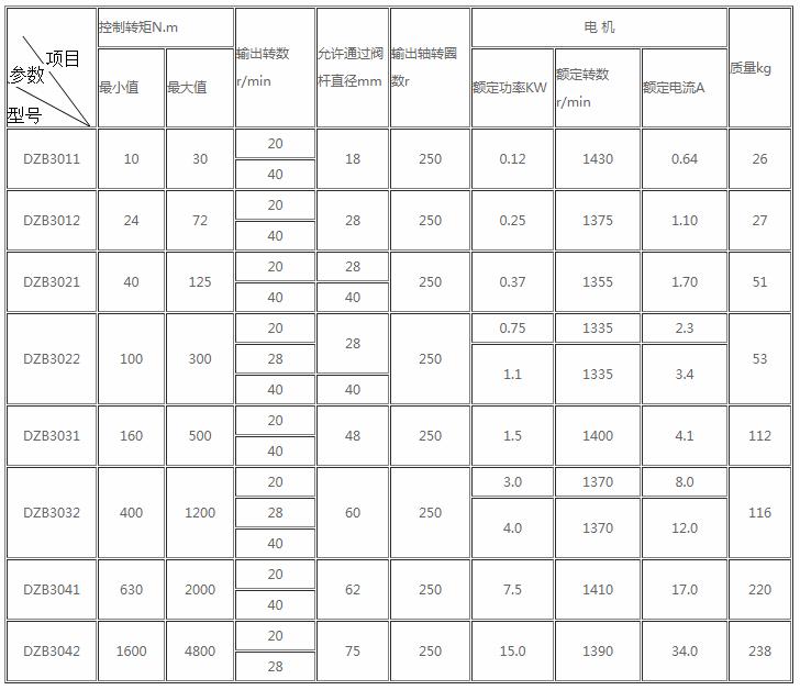 四、DZB系列閥門電動裝置主要技術性能參數表