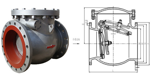 閥瓣在閥體內腔處于自然下垂狀態,當開泵正常運行時,管路內的壓力將閥瓣推動沿閥桿軸線轉動而開啟,介質通過;停泵時,閥瓣以自身重力和介質回流的壓力而自動關閉實現止回。