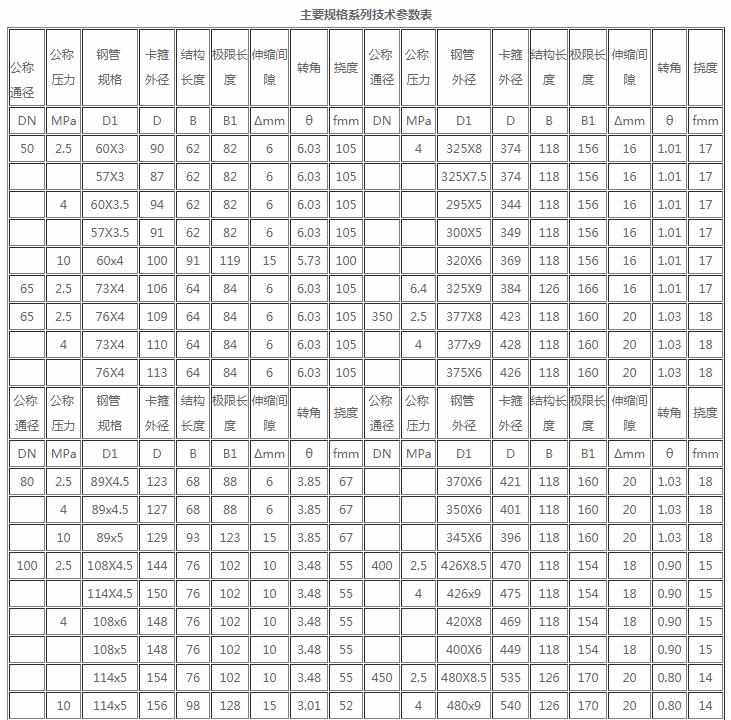 本系列卡箍式柔性管接頭是按國家標準管徑配套和根據鑄石復合管,管徑配套設計,每項通徑分幾種規格,如工程中還需其它規格管徑在訂貨時注明我廠可進行設計配套卡箍。